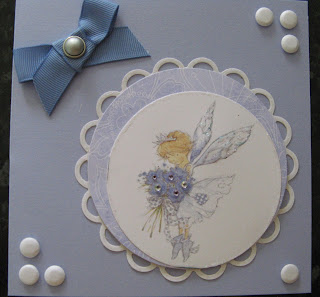 The image is yet another LOTV square. The card, backing paper and ribbon are all Stampin Up. I've edged her wings and tiara and also the circle and lace edge of the outer circle in glitter but you can't really see them on the photo.